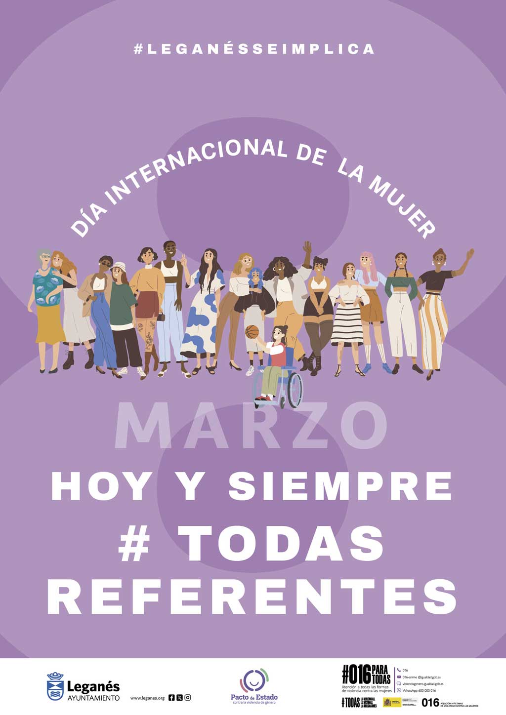 Desde el Ayuntamiento de Leganés, un año más, reiteramos nuestro compromiso en defensa de la igualdad entre mujeres y hombres y hacemos un llamamiento a toda la ciudadanía, a las instituciones y a las organizaciones para que se sumen a la conmemoración del Día Internacional de la Mujer. Día Internacional de todas las mujeres."