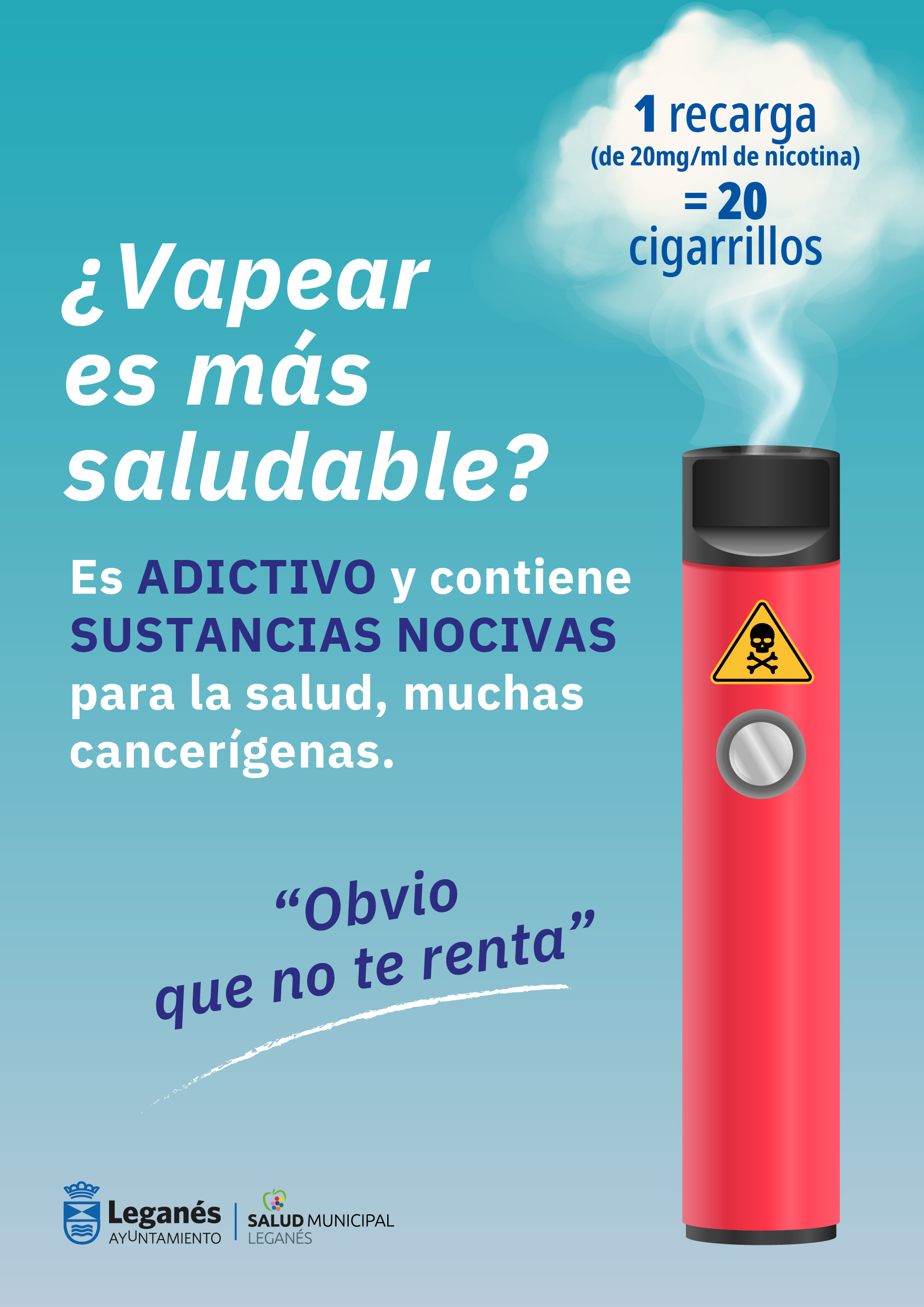 Debido al aumento alarmante de los adolescentes y jóvenes que han probado o utilizan cigarrillos electrónicos. Salud Municipal inicia una campaña de sensibilización para alertar sobre el uso del vaper y sus consecuencias para la salud titulada ¿VAPEAR ES MÁS SALUDABLE? con la que queremos visibilizar los riesgos que tienen las nuevas formas de fumar.